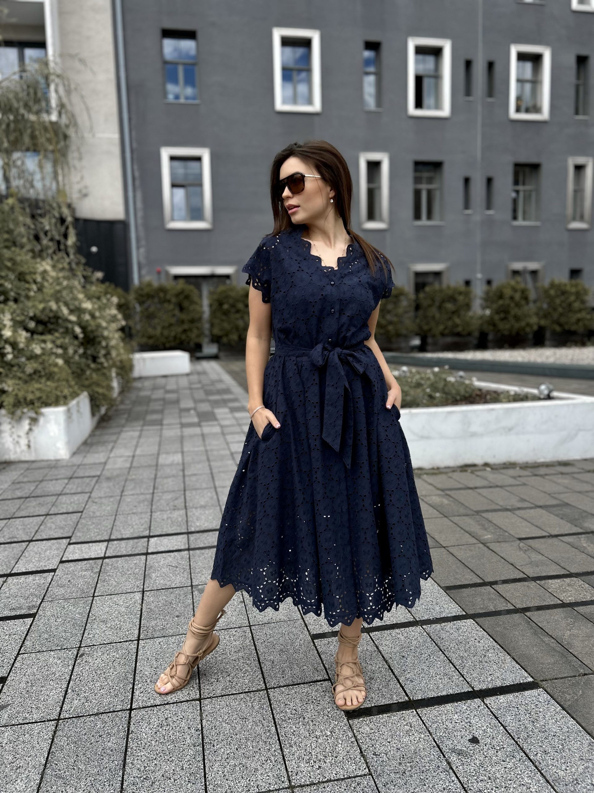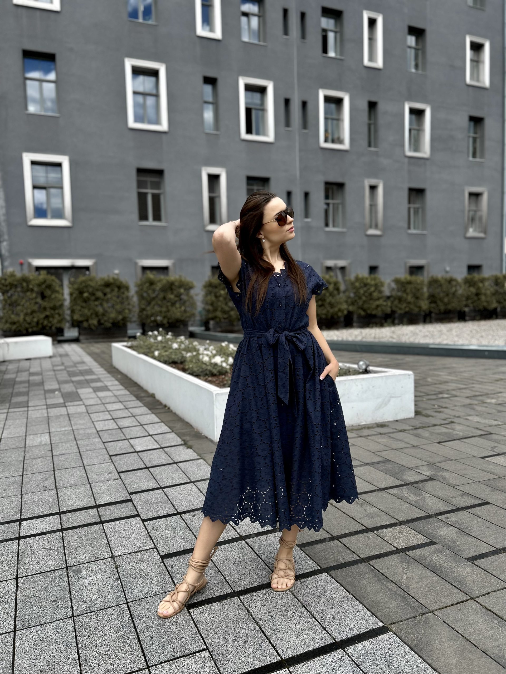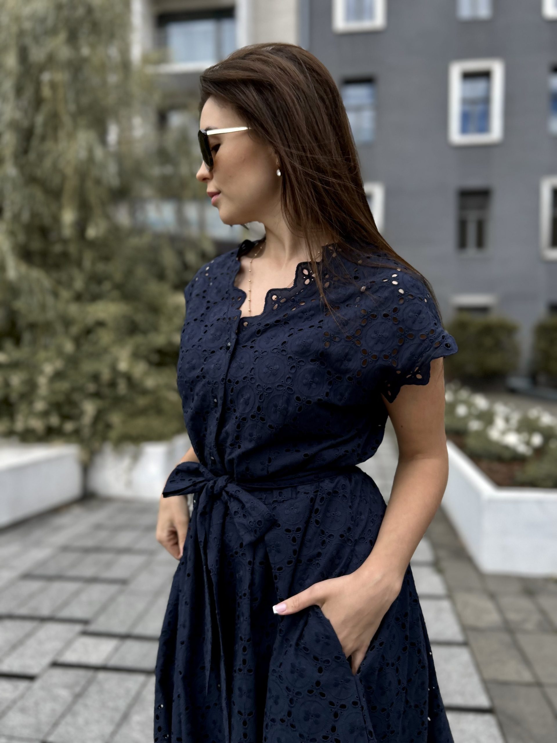 NAVY BLUE kleita XS/S izmērs. MILKY WHITE kleita M/L izmērs. Modeles parametri: auguma garums 166cm, krūšu apkārtmērs 86cm, viduklis apkārtmērs 73cm, gurni apkārtmērs 103cm.