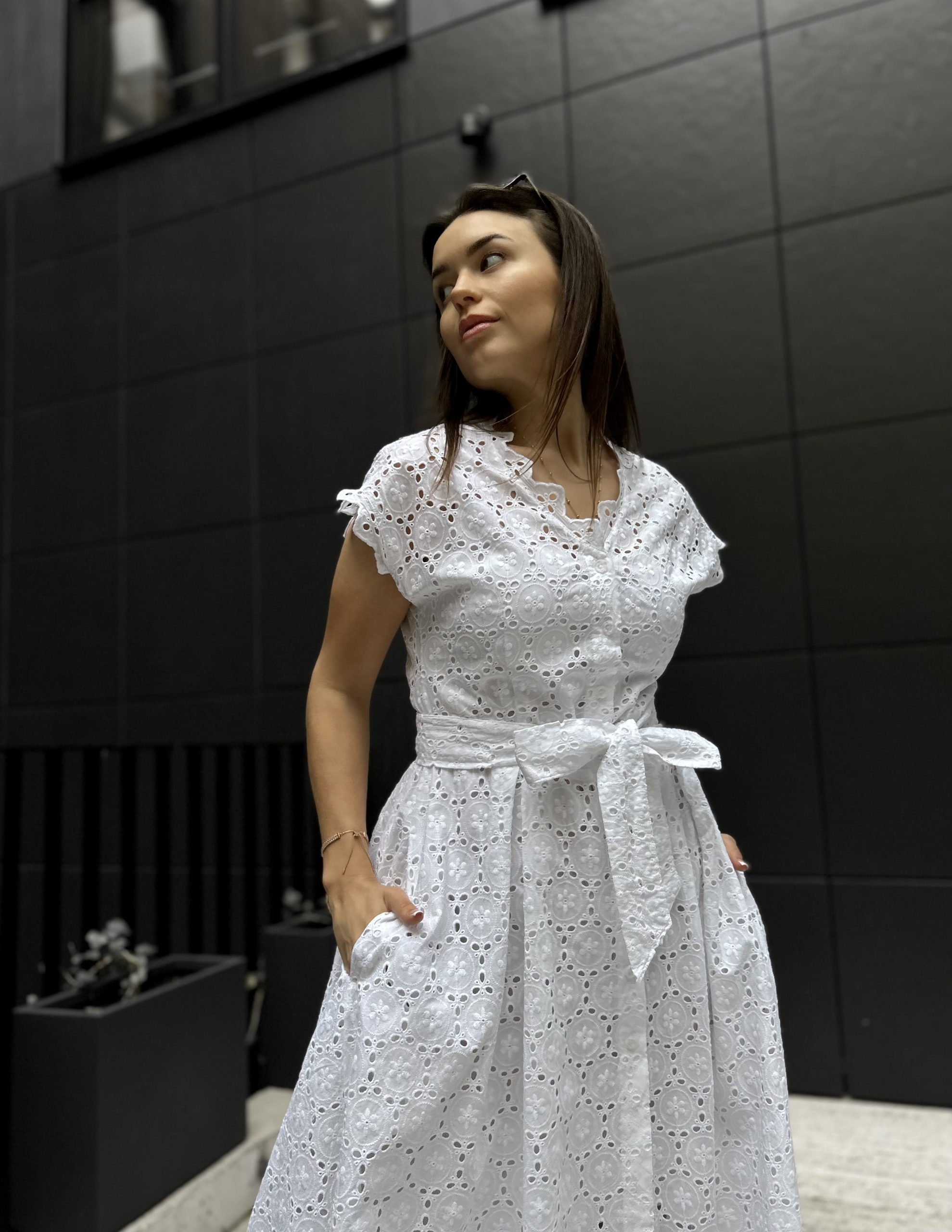 MILKY WHITE kleita XS/S izmērs. NAVY BLUE kleita M/L izmērs. Modeles parametri: auguma garums 166cm, krūšu apkārtmērs 86cm, viduklis apkārtmērs 73cm, gurni apkārtmērs 103cm.