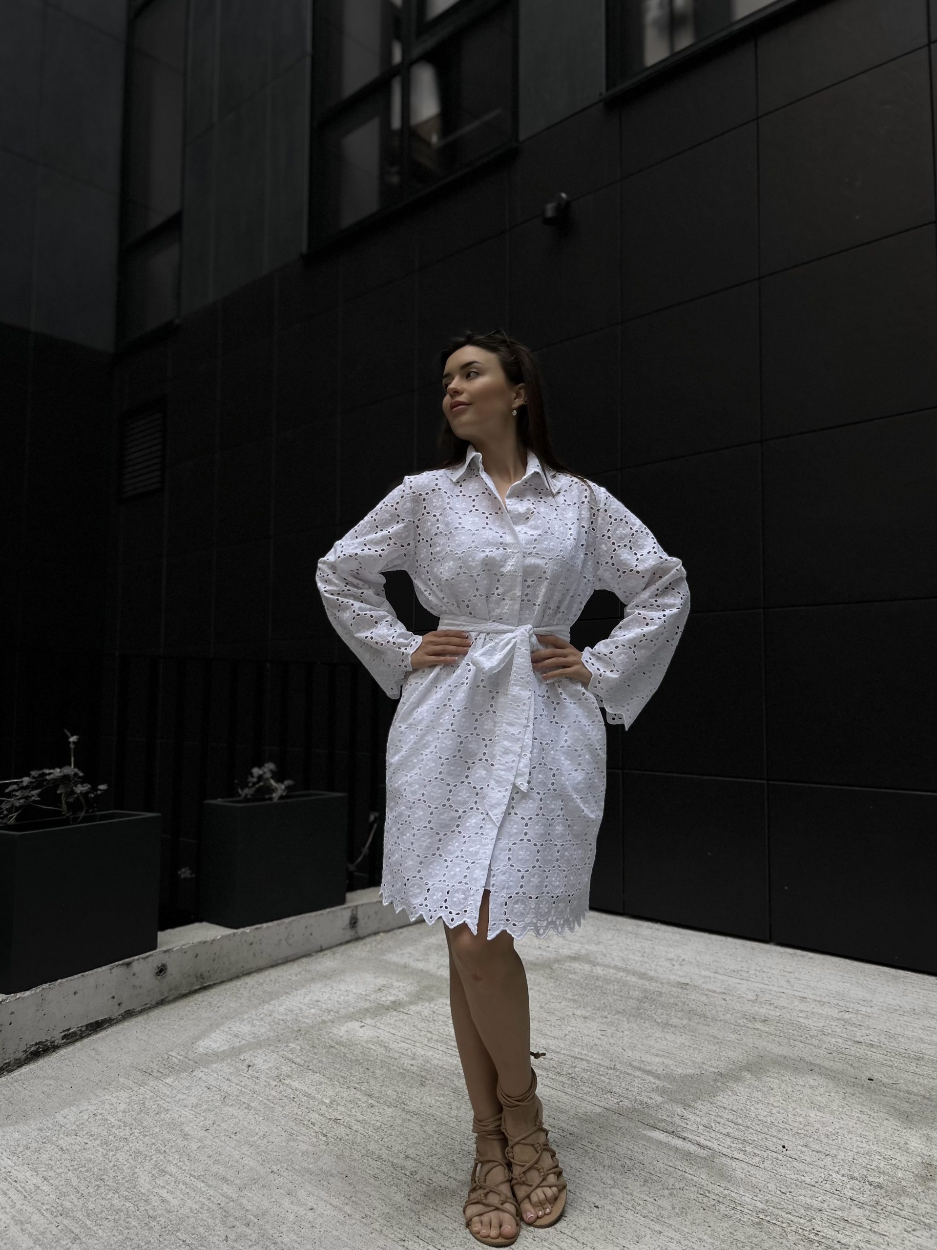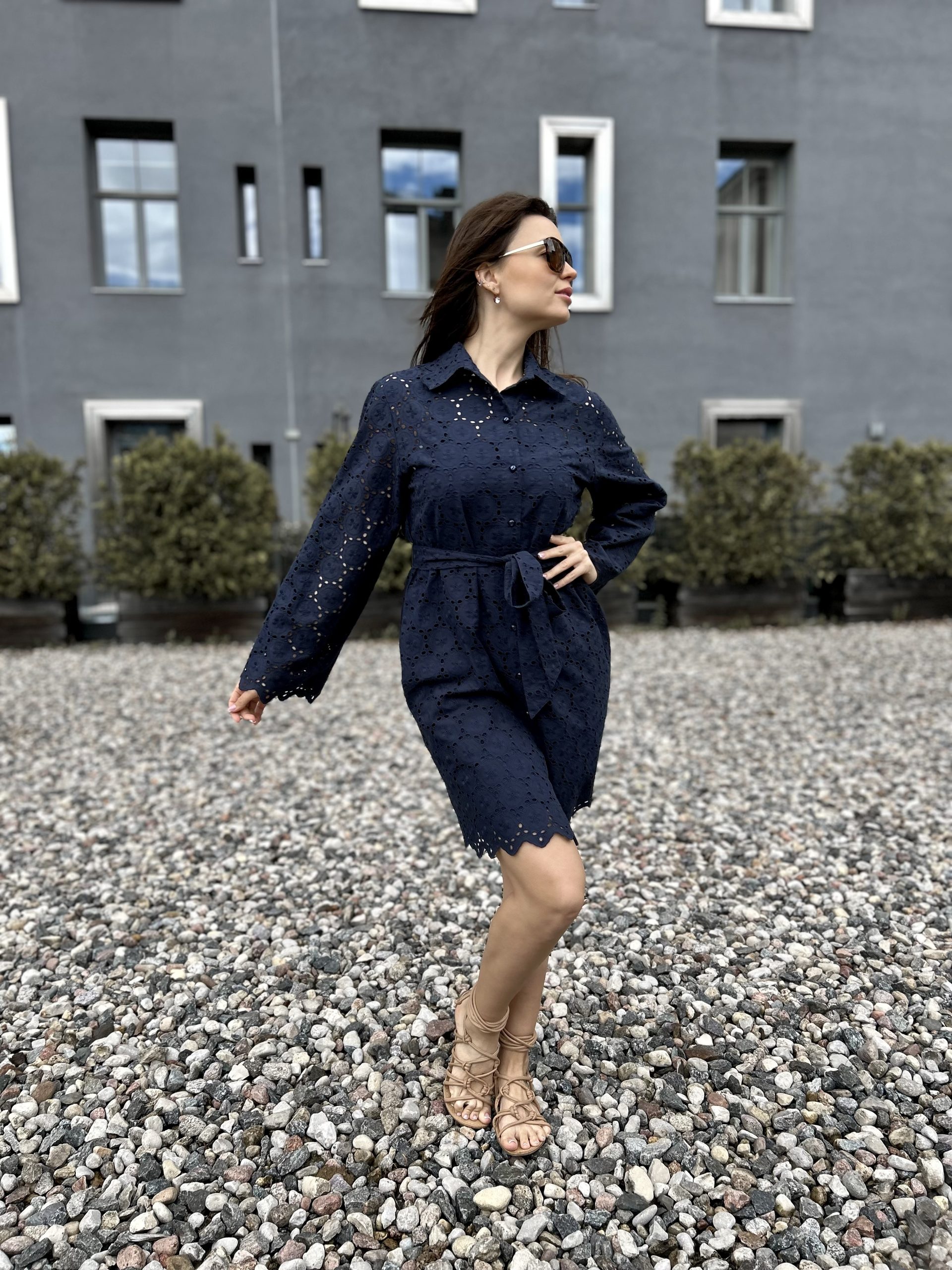 NAVY BLUE kleita XS/S izmērs. MILKY WHITE kleita M/L izmērs. Modeles parametri: auguma garums 166cm, krūšu apkārtmērs 86cm, viduklis apkārtmērs 73cm, gurni apkārtmērs 103cm.