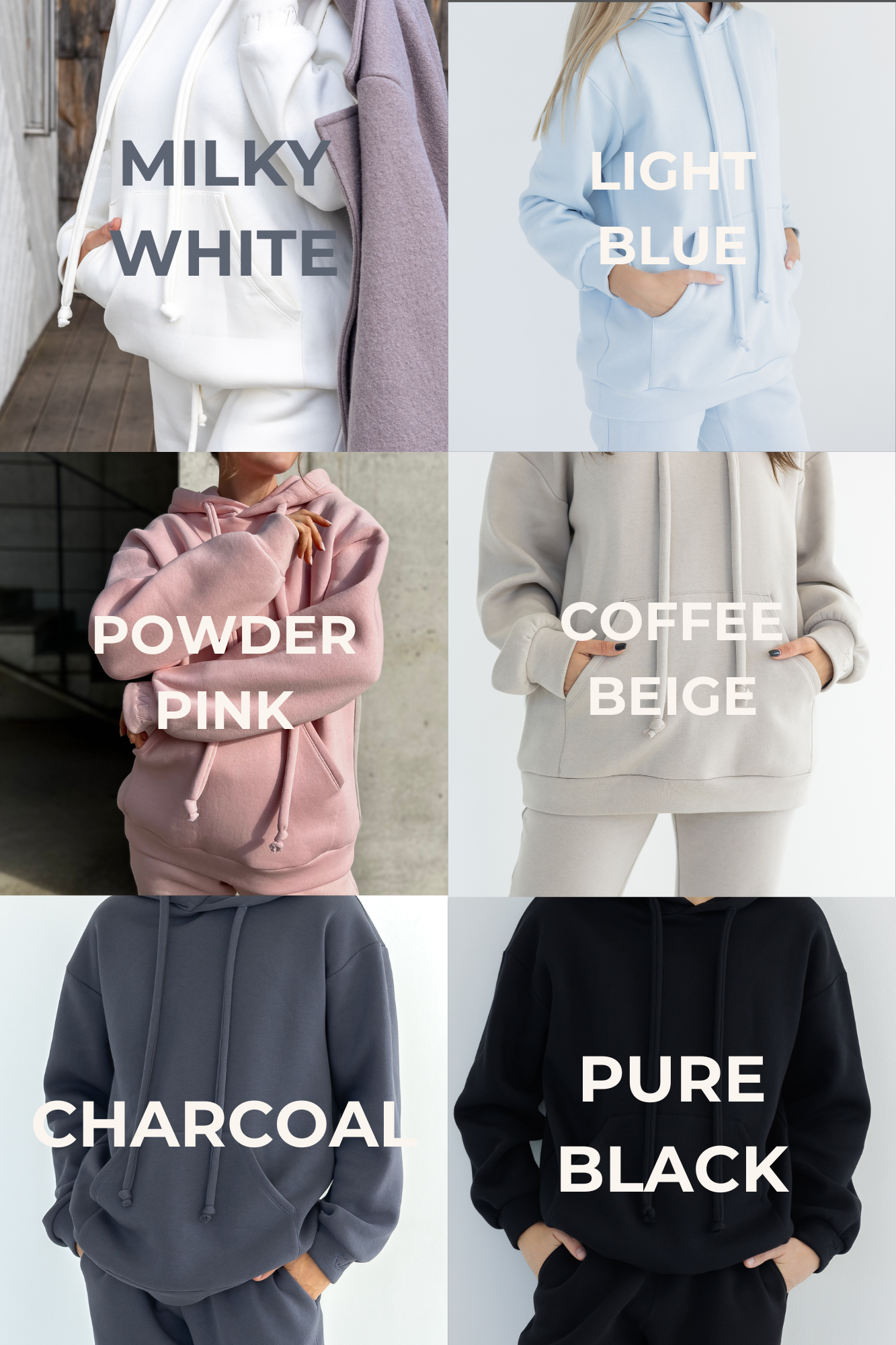 BLACK, CHARCOAL, COFFEE BEIGE, LIGHT BLUE, MILKY WHITE, POWDER PINK, RASPBERRY SORBET